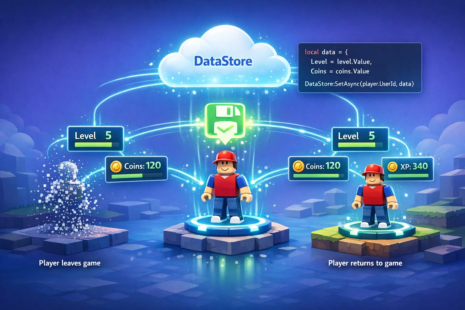 В Роблокс Студио для этого используется система DataStore. Она позволяет сохранять данные игрока на сервере и загружать их при следующем входе в игру.